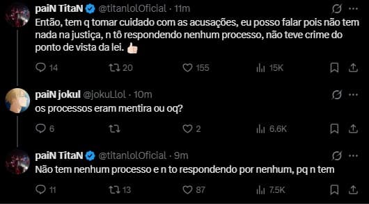 Nesta terça-feira (11), pela primeira vez, TitaN se pronunciou sobre as polêmicas em uma publicação no seu X (Antigo Twitter). O que chamou atenção foi que, nos comentários de sua publicação, o jogador fez questão de afirmar que não há processo algum em curso e, do ponto de vista da lei, “não teve nenhum crime”.